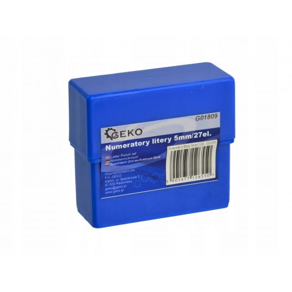 Zestaw numeratorów marki GEKO wykonany z wysokiej jakości stali węglowej, składający się z liter od A do Z oraz znak & o wysokości 5 mm.