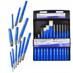 Zestaw przecinaków, wybijaków i punktaków ze stali chromowo-wanadowej. Narzędzia przydatne m.in. do zaznaczania środka otworów przed wierceniem, do cięcia blachy i prętów oraz wybijania elementów metalowych.