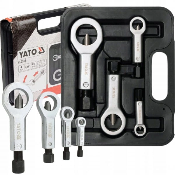 Zestaw do usuwania nakrętek ze zniszczonymi łbami. Uszkodzoną nakrętkę chwyta się ramieniem o dopasowanej wielkości (4 rodzaje od 9-27mm), następnie dokręca śrubę dociskową, która powoduje że przecinak niszczy i luzuje nakrętkę. Za pomocą ramienia można częściowo odkręcić rozciętą nakrętkę.