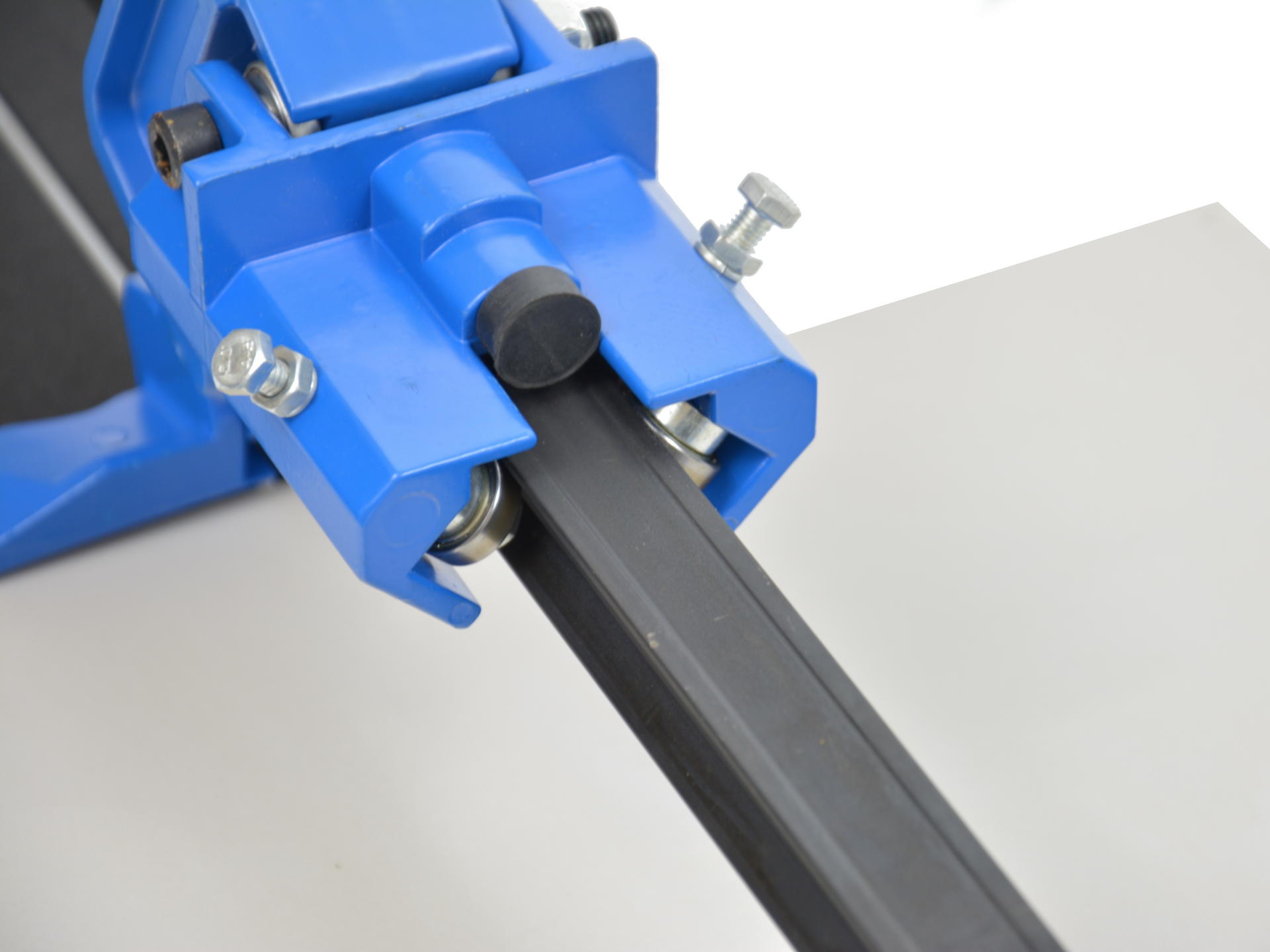 Profesjonalny przyrząd do cięcia glazury o długości powierzchni roboczej 800 mm. Wytrzymałe ostrze z węglika wolframu pokrytego warstwą tytanu zapewnia szybkie cięcie. Stabilna szyna z mechanizmem tnącym na łożyskach kulkowych zapewnia precyzyjne cięcie płytek o grubości do 16 mm. Metalowa linijka pozwala na dokładny pomiar cięcia i ustawienie kąta cięcią w przedziale od 0 do 60°. Aluminiowa podstawa z gumowymi nózkami zapewnia stabilność urządzenia w czasie pracy.