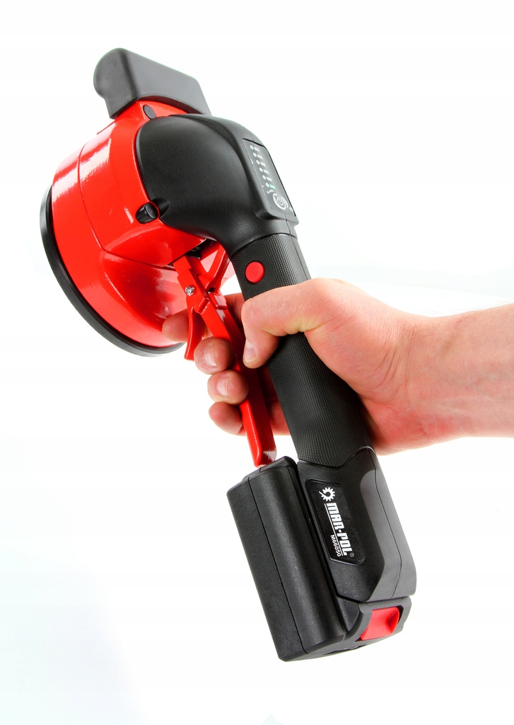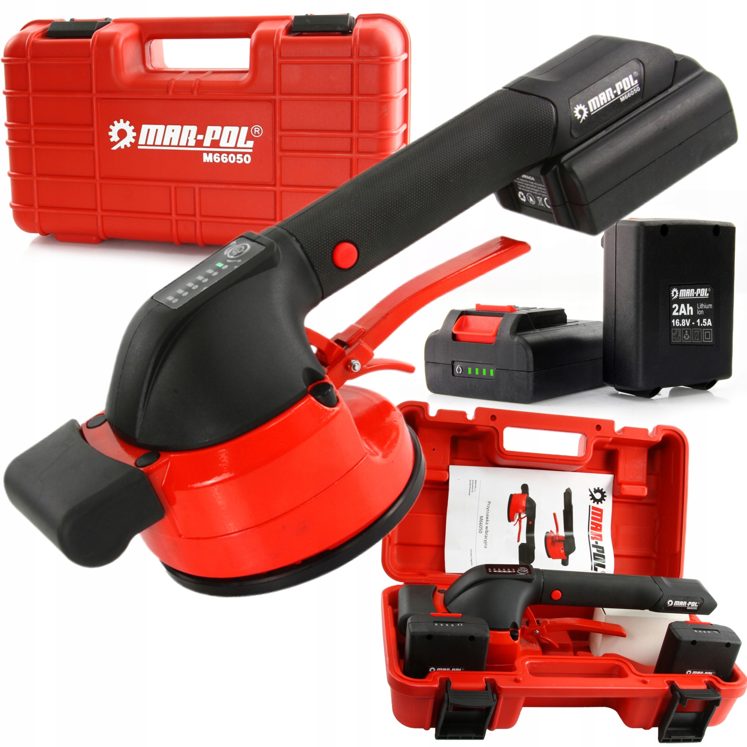 Przyssawka MAR-POL zasilana baterią litową 16,8 V może być stosowana do instalacji wewnątrz i na zewnątrz. Zastępuje tradycyjną obsługę ręczną i pomaga uniknąć problemów z powodu nieprawidłowego rozprowadzenia kleju pod płytkami i dużymi płytami.