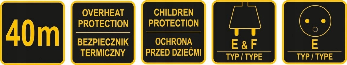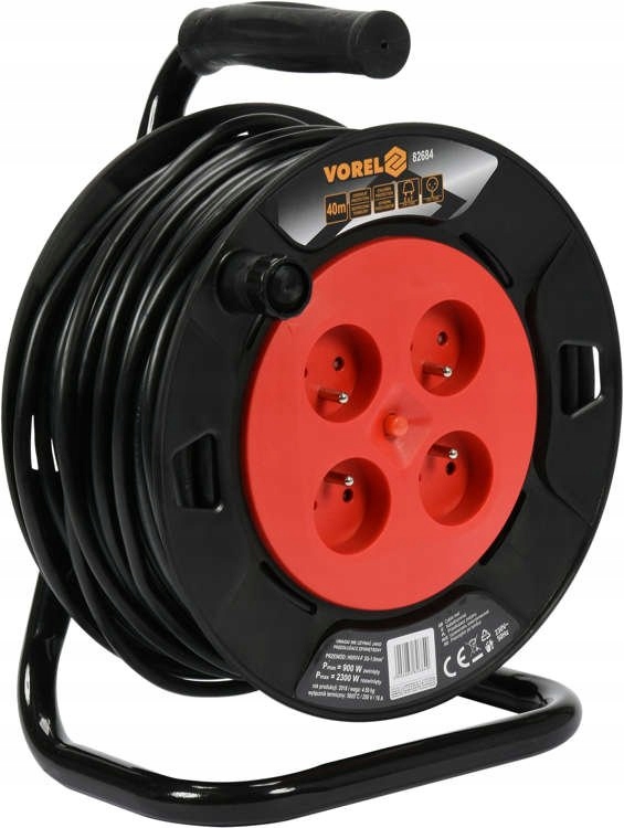 Przedłużacz bębnowy marki VOREL 82684 o długości 40 metrów z 4 gniazdami, zabezpieczeniem termicznym oraz zabezpieczeniem przed dziećmi. Przewód nawinięty na bęben wykonany z tworzywa. Bęben osadzony na metalowym stelażu z gumową rękojeścią. Rączka umieszczona przy krawędzi bębna przyspiesza zwijanie, a gumowy element przymocowany do przewodu kilka centymetrów przed wtyczką umożliwia zaczepienie go np. do krawędzi bębna, co znacznie ułatwia przechowanie i transport zwiniętego przedłużacza.