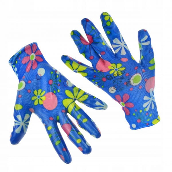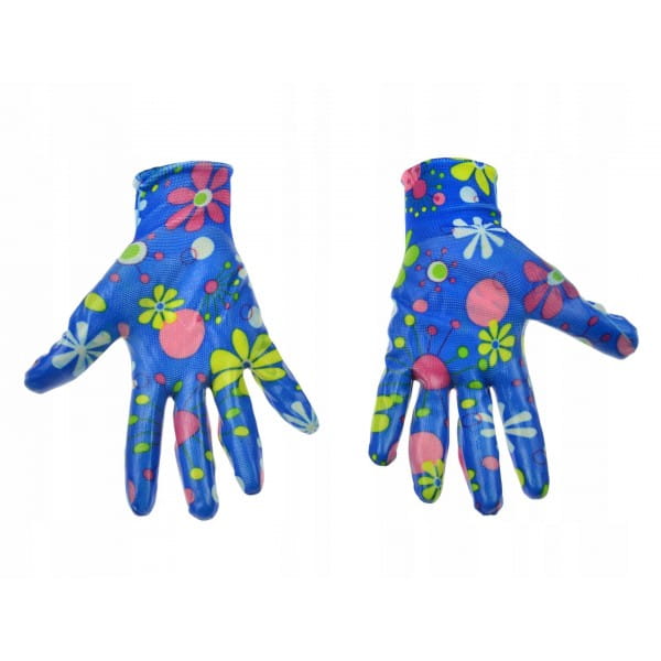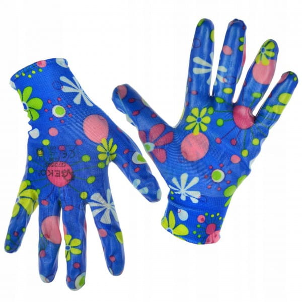 Rękawice robocze ogrodowe damskie, pokryte warstwą nitrylu. Rękawice spełniają normę EN 388 (tzw. rękawice antyprzecięciowe).