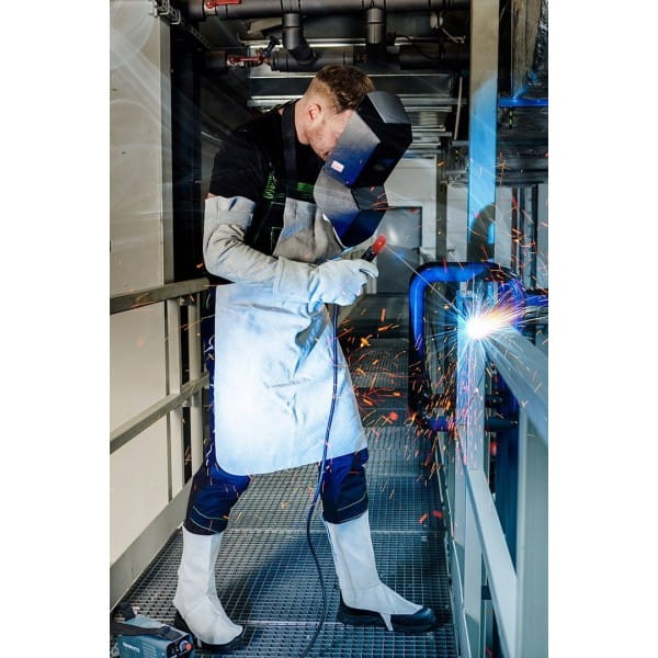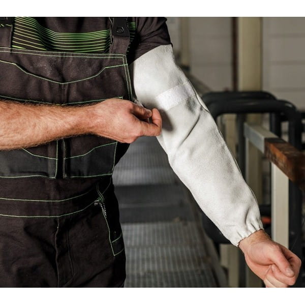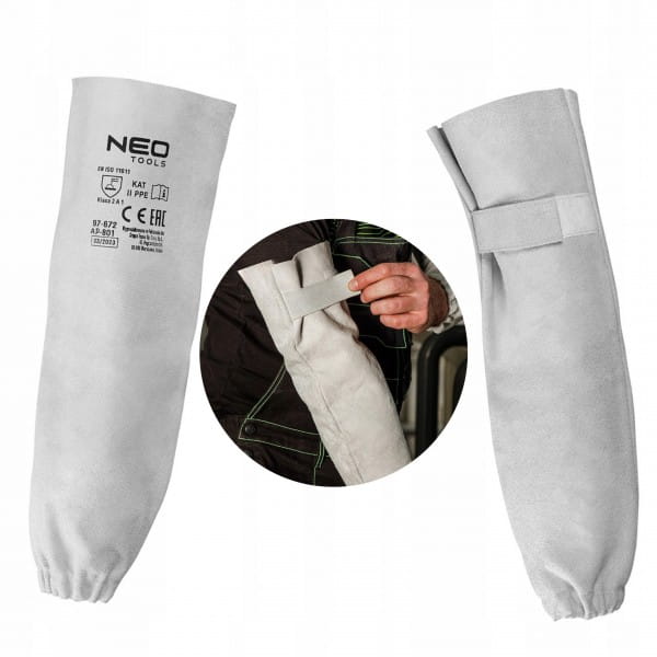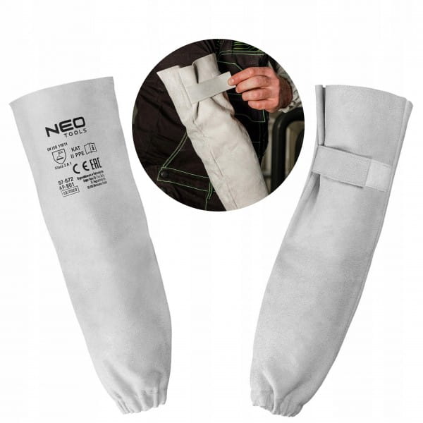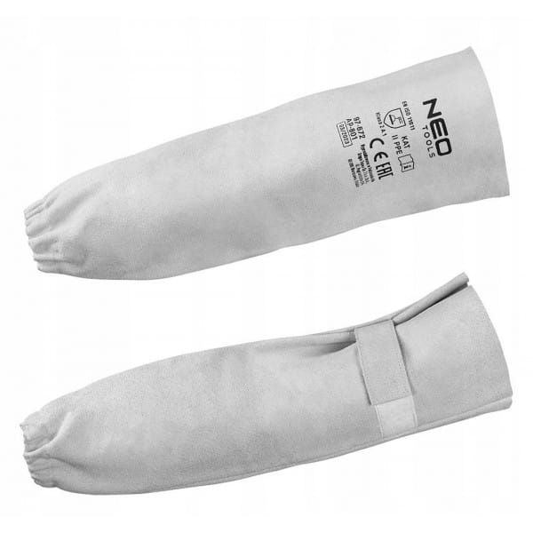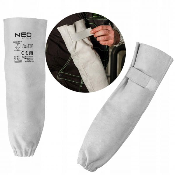 Zarękawki spawalnicze skórzane 97-672 marki NEO to para zarękawków wykonanych z dwoiny bydlęcej, zapinanych na rzep w górnej części oraz posiadających wszyty elastyczny pasek na poziomie nadgarstków. Zapewniają odpowiednie dopasowanie i ochronę przed niebezpiecznymi czynnikami w zadaniach spawalniczych. Charakteryzują się szarym, uniwersalnym kolorem. Posiadają zgodność z normami EN ISO 13688:2013, EN ISO 11611:2015 i należą do 2 klasy ochronnej. Wysoką jakość zarękawków marki NEO potwierdza certyfikat CE.
