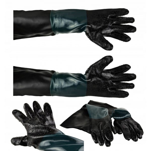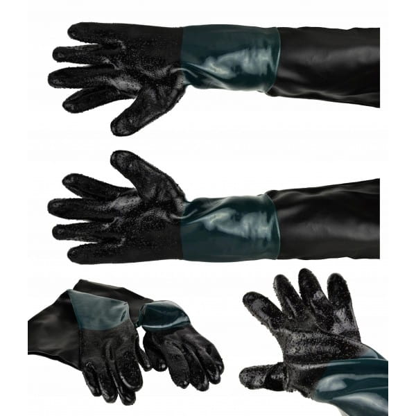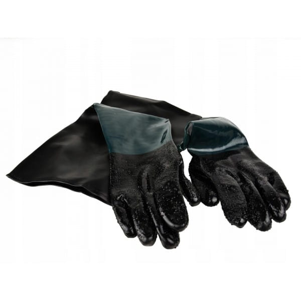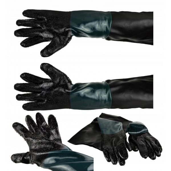 Rękawice do piaskowania wykonane z gumy, winylu i skaju. Część robocza o strukturze chropowatej pozwala na pewniejszy chwyt obrabianego przedmiotu.