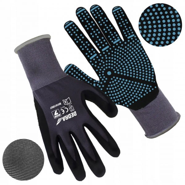 - Część chwytna powlekana pianką nitrylową z dodatkowymi kropkami z PCV - doskonała przyczepność i pewność chwytu