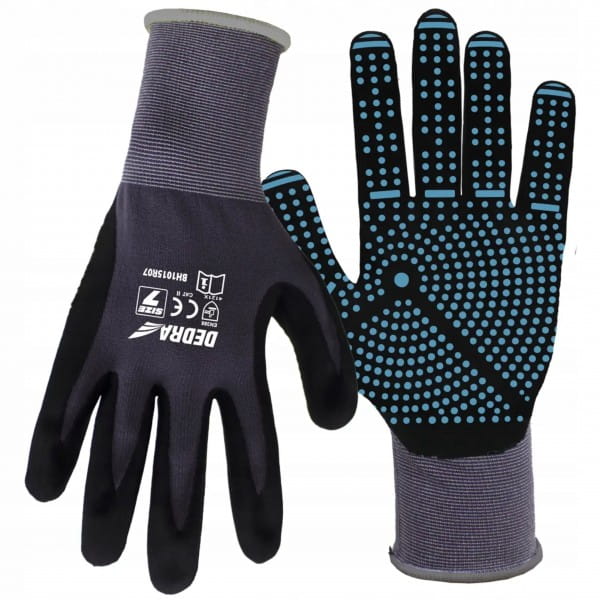 Część chwytna rękawic została pokryta pianką nitrylową z dodatkowymi kropkami PCV, dzięki czemu rękawice zyskały zwiększoną odporność na oleje oraz dodatkową przyczepność. Elastyczny, ale jednocześnie mocno przylegający mankiet chroni przed przedostawaniem się niechcianych substancji do wnętrza rękawicy. Dodatkowo, specjalna spieniona struktura zapewnia odpowiednią oddychalność, zwiększając komfort pracy.