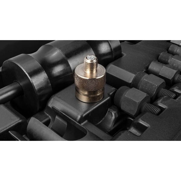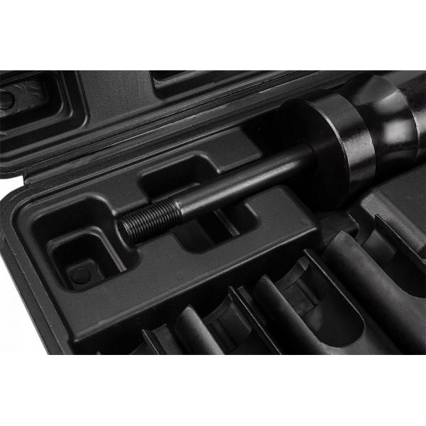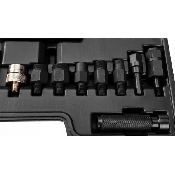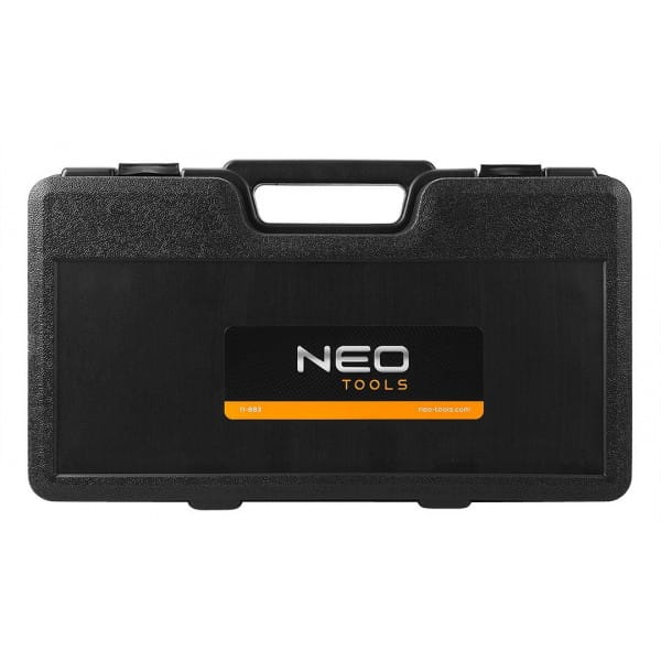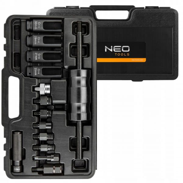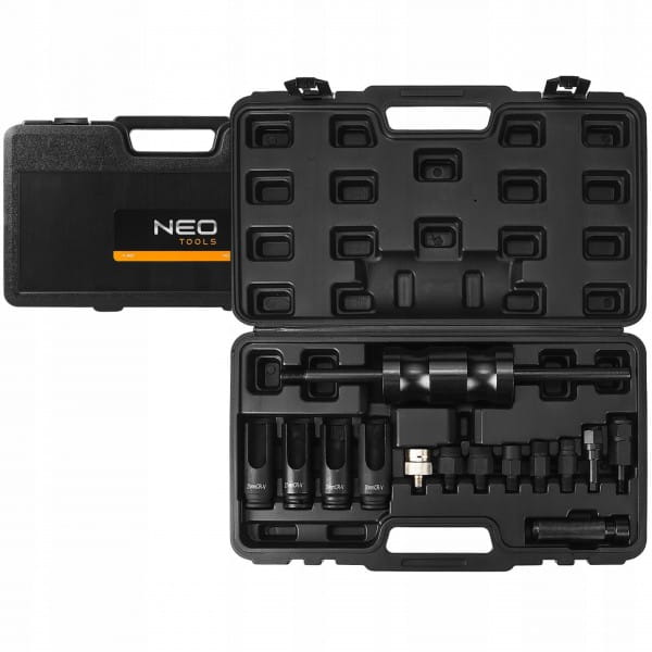Ściągacze do wtrysków z młotkiem bezwładnościowym - zestaw 14 szt. 11-883, NEO TOOLS przeznaczony do demontażu zapieczonych wtryskiwaczy. Wchodzący w skład zestawu młotek bezwładnościowy ułatwia pracę w ograniczonej przestrzeni komory silnika. Elementy znajdują się w walizce.