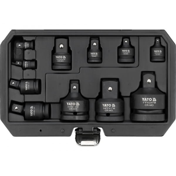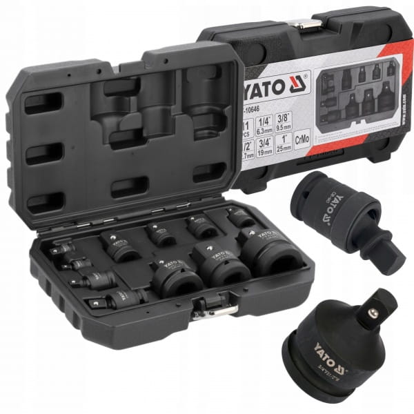 Zestaw udarowych redukcji i przegubów YATO do stosowania w przemyśle mechanicznym, serwisach motoryzacyjnych m.in. do napraw głowic, piast, wrzecion, układów napędowych czy skrzyni biegów.