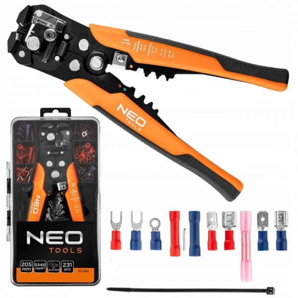Automatyczny ściągacz izolacji 205 mm, czołowy + konektory 230 szt. 01-542 marki NEO to narzędzie ze szczękami czołowymi z trwałej stali Cr12MoV o twardości 52-58 HRC. Korpus wykonano z kolei z równie wytrzymałej stali A3. Zakres pracy ściągacza wynosi od 0,5 do 6 mm2 (22-10 AWG), z kolei zakres zaciskania końcówek konektorowych nieizolowanych to 0,5-6mm2, a izolowanych 0,5-8mm2. Narzędzie posiada ustawiany ogranicznik izolacji oraz praktyczny obcinak do kabli. Ergonomiczna rękojeść dwukomponentowa TPR+PP zapewnia solidny i pewny chwyt. Zestaw oferuje: czerwone i niebieskie konektory izolowane typ oczko: po 15 sztuk, czerwone i niebieskie konektory izolowane typ widelec: po 15 sztuk, czerwone i niebieskie konektory izolowane typ nasuwka damska: po 15 sztuk, czerwone i niebieskie konektory izolowane typ wsuwka męska: po 15 sztuk, czerwone i niebieskie łączniki izolowane: po 10 sztuk, czerwone łączniki izolowane bryzgoszczelne: 10 sztuk, czerwone konektory izolowane tulejkowe 1.0mm: 25 sztuk, czerwone konektory nieizolowane tulejkowe 0,75mm: 25 sztuk, drut 15 szt., opaski zaciskowe 15 szt. 2.5x100mm. Polecany jest profesjonalistom.