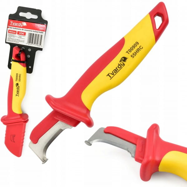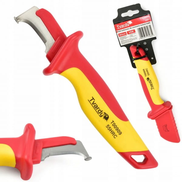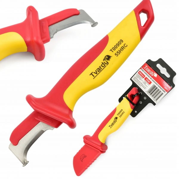 Nóż izolowany VDE 1000V przeznaczony do ściągania izolacji. Ergonomiczna, wielokomponentowa rękojeść zapewnia skuteczną izolacje do 1000V. Doskonale sprawdzą się podczas wykonywania wszelkiego rodzaju prac przy instalacjach niskonapięciowych. Sierpowate ostrze wykonane ze stali nierdzewnej 3Cr13 poddanej odpowiedniej obróbce cieplnej w celu uzyskania optymalnej twardości na poziomie 55 HRC. Ostrze zakończone stopką ślizgową ułatwiającą ściąganie izolacji.