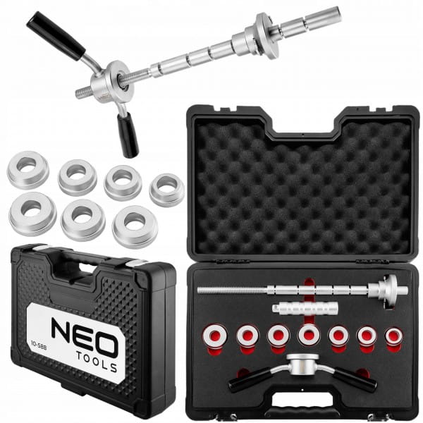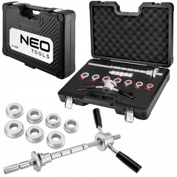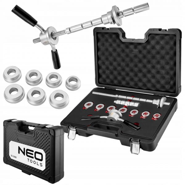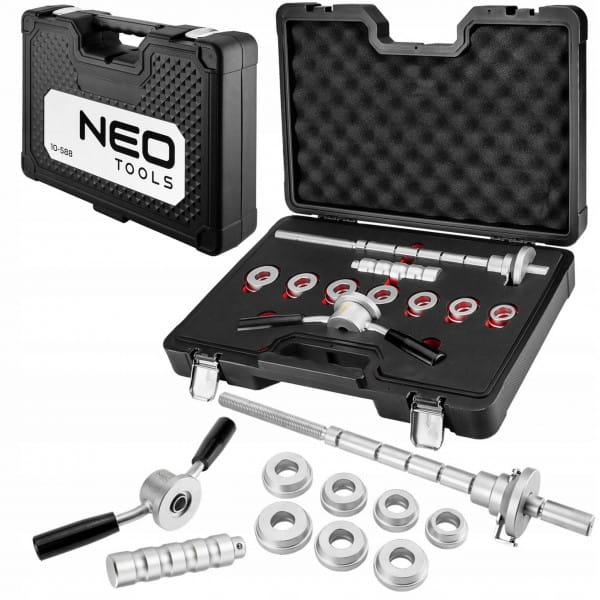 Zestaw narzędzi do montażu i demontażu łożysk główki ramy w motocyklach 10-588 NEO to praktyczny komplet elementów, który umożliwia prosty montaż bez obawy o uszkodzenie łożysk lub belki osi. Kompatybilny jest z większością łożysk. W zestawie oferowane są m.in. wytrzymałe, stalowe pierścienie. 7 sztuk adapterów do łożysk cechuje się średnicami w zakresie od 32 do 46 mm. Komplet zawiera również solidną prowadnicę oraz uchwyt typu T. Całość oferowana jest w praktycznej walizce z tłoczeniami, zapewniającymi porządek oraz wygodę użytkowania. Zestaw narzędzi marki NEO polecany jest do wymagających zadań.