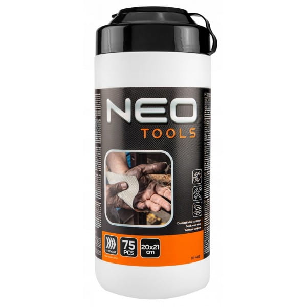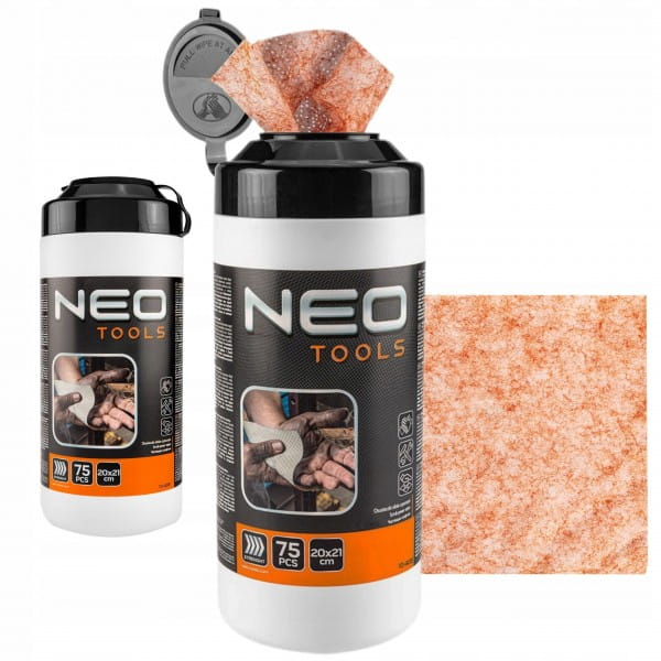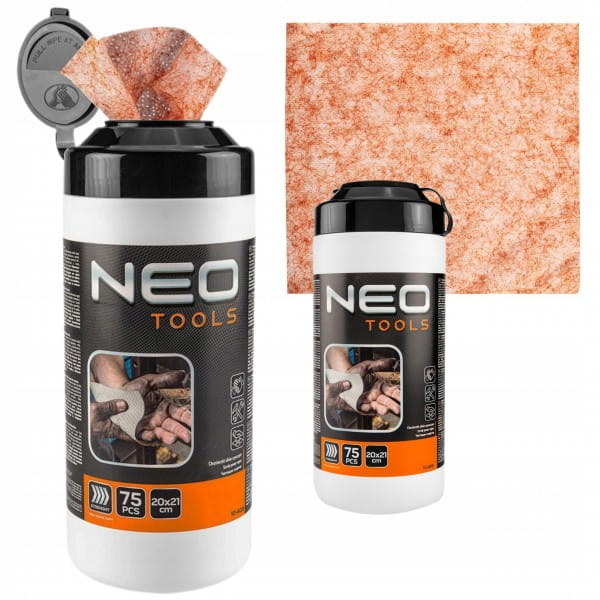 Chusteczki ze ścierniwem do mycia rąk oraz czyszczenia powierzchni i narzędzi, słoik 75 szt. NEO (nr ref. 10-408) o zapachu cytrusowym usuną trudne zabrudzenia z dłoni, narzędzi i innych powierzchni. Przeznaczone dla fachowców pracujących w budownictwie, motoryzacji, poligrafii, lakiernictwie. W wygodnej formule jednorazowych chusteczek, pomagają pozbyć się plam po specjalistycznych klejach, żywicy, silikonie, lakierach, farbach, piankach poliuretanowych oraz polimerach. Chusteczki zawierają naturalne drobinki ścierające z krzemionki. Posiadają naturalne pH dla skóry. W słoiku znajduje się 75 sztuk chusteczek w rozmiarze 20 x 21 cm.