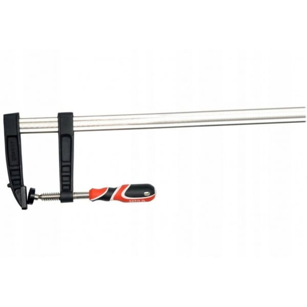 Ścisk stolarski typu f. Gruba, stabilna szyna usztywniona dodatkowymi przetłoczeniami. Ramiona o wzmocnionym profilu, śruba z gwintem o specjalnym nakroju. Talerz dociskowy osadzony na przegubie kulowym, łatwo dopasowuje się do powierzchni a miękkie osłony z tworzywa chronią ściskany materiał. Rękojeść osłonięta miękkim technicznym tworzywem pozwala na silne zaciśnięcie materiału. Stabilny,mocny ścisk do prac stolarskich i montażowych.