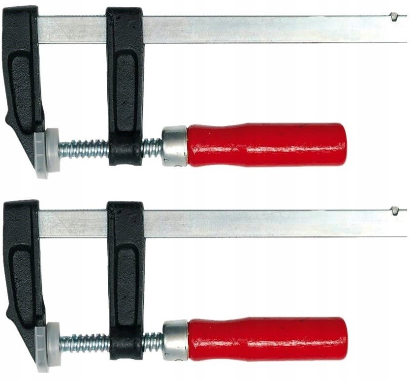 Zestaw 2 ścisków stolarskich 150x50mm. Szczęki wykonane ze specjalnego żeliwa, stabilna cynkowana stalowa szyna i śruba dociskowa z wahliwą płytką dociskową - gwarantują skuteczną, efektywną pracę. Rękojeść drewniana lakierowana wzmocniona metalową skuwką.