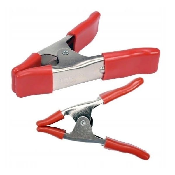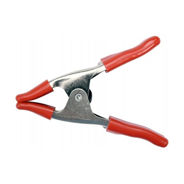 Metalowy ścisk sprężynowy o duże sile ściskania . Wykonany z galwanizowanej blachy stalowej, końcówki robocze i uchwyty powleczone warstwą czerwonego winylu. Długość całkowita 100 mm , rozwarcie 25 mm , głębokość 25 mm. Do silnego , szybkiego zaciskania materiałów podczas obróbki.