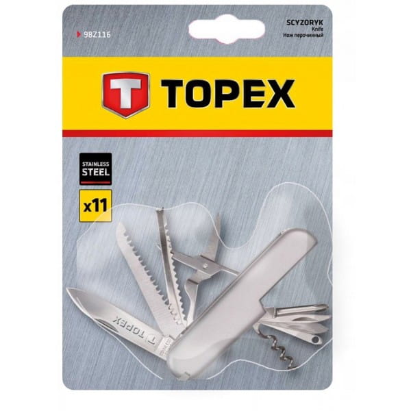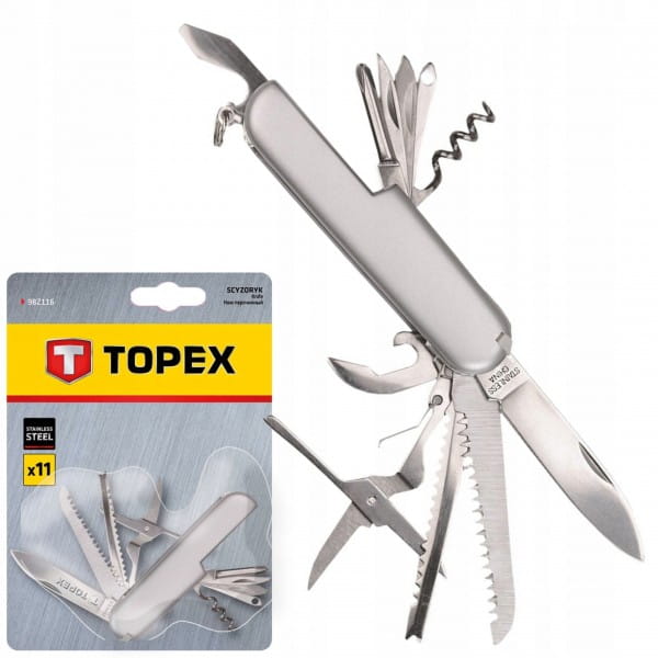 Scyzoryk TOPEX (nr ref. 98Z116) to uniwersalne, wielofunkcyjne narzędzie. Zawiera 11 różnych końcówek o szerokim wachlarzu zastosowań. Wykonany z wysokiej jakości stali nierdzewnej, co zapewnia długą żywotność. Dzięki kompaktowemu rozmiarowi scyzoryk można mieć zawsze przy sobie. Marka TOPEX skierowana jest do majsterkowiczów.