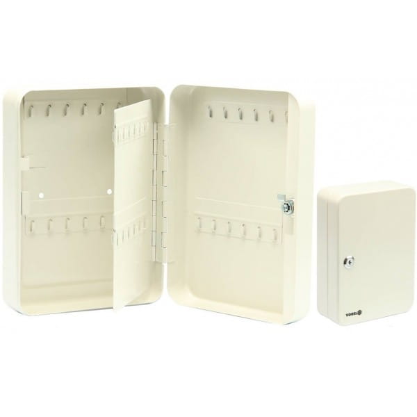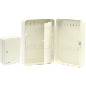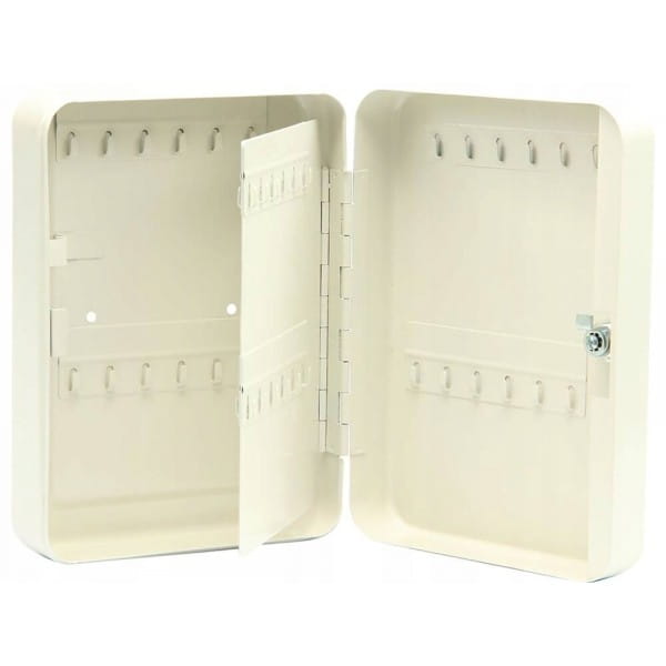 Skrzynka na 48 kluczy o wymiarze 250x180x80mm. Wykonana z blachy stalowej o grubości 0,7 mm, lakierowana w kolorze kości słoniowej. Wewnątrz 8 rzędów z hakami do zawieszania kluczy. W zestawie naklejki z cyframi do oznaczania haków. Drzwiczki szafki zamykane na zamek z 2 kluczykami. Tylny panel z otworami montażowymi
