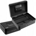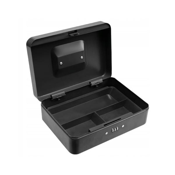 Przenośna kaseta na pieniądze o wymiarze 250x180x90mm. Wykonana z blachy stalowej o grubości 0,7mm, pomalowana w kolorze czarnym. Zamykana na zamek szyfrowy. Wewnątrz wyciągana wkładka na monety wykonana z tworzywa sztucznego. Podręczna kaseta do bezpiecznego przechowywania pieniędzy.