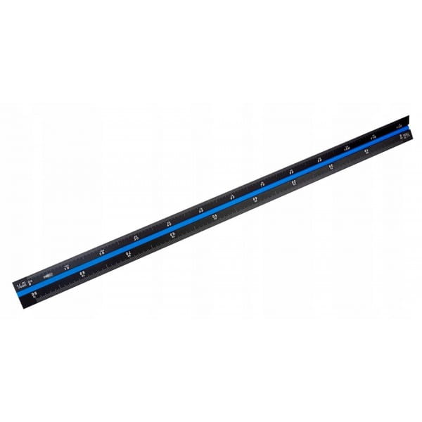 Linijka trójkątna, 30 cm, znaczniki kolorystyczne wykonane z PCV, wykonane z wysokiej jakości anodowego aluminium, boki linijki oznaczone kolorami w zależności od skali dla łatwego wyboru pożądanej skali: czerwony- skala 1:100; 1:200, niebieski- skala: 1:300; 1:400, żółty- skala 1:500; 1:600