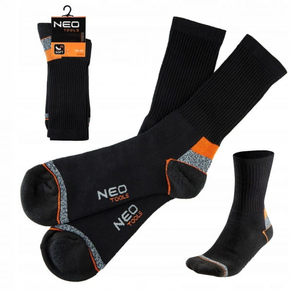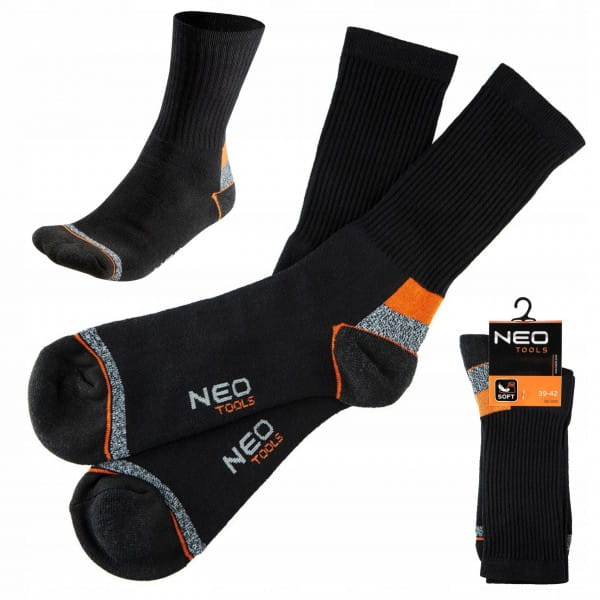 Specjalistyczne skarpety NEO wykonane z wysokiej jakości bawełny z dodatkiem poliestru i elastanu, zapewniają komfort i higienę pracy. Na palcach oraz piętach zastosowano wzmocnienia, które chronią przed szybkimi przetarciami. W dyskretnym czarnym kolorze z pomarańczowo-szarymi wstawkami.