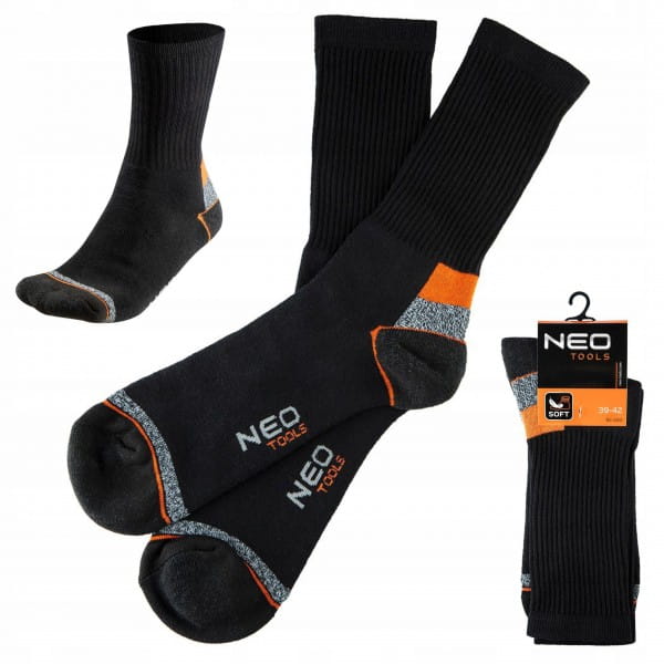 Specjalistyczne skarpety NEO wykonane z wysokiej jakości bawełny z dodatkiem poliestru i elastanu, zapewniają komfort i higienę pracy. Na palcach oraz piętach zastosowano wzmocnienia, które chronią przed szybkimi przetarciami. W dyskretnym czarnym kolorze z pomarańczowo-szarymi wstawkami.