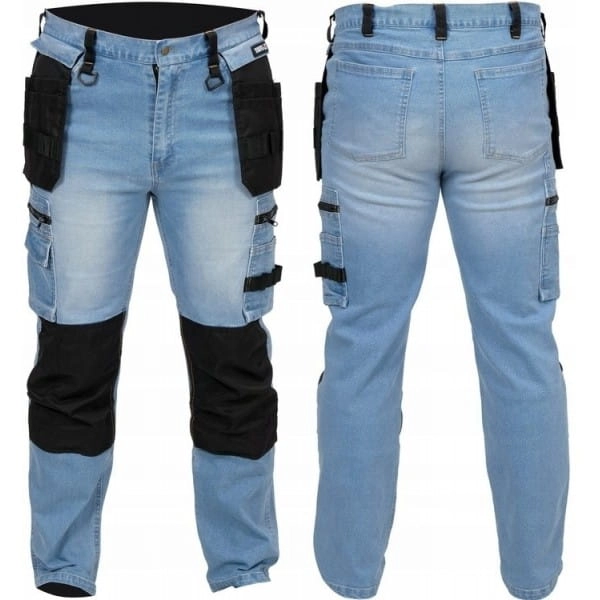 Spodnie robocze monterskie z elastanem wykonane z przetartego i rozciągliwego jeansu.