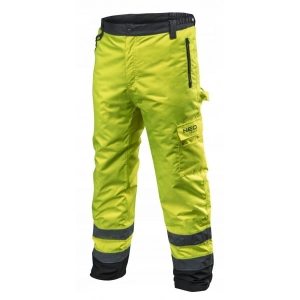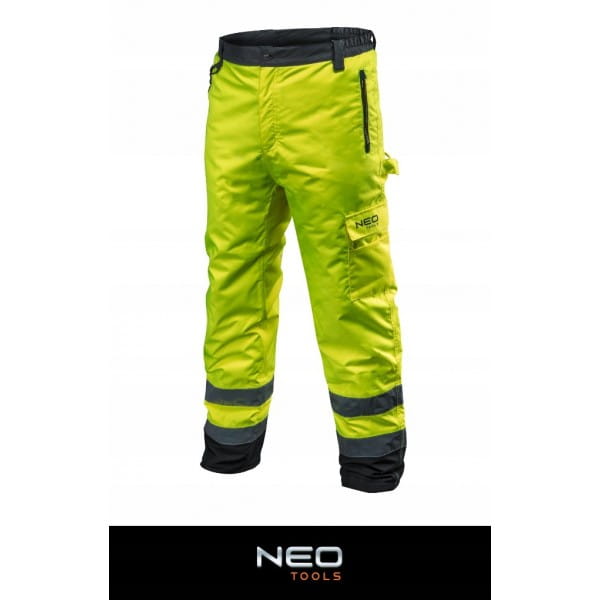 Ocieplane, spodnie robocze NEO o intensywnej widzialności, wykonane z wysokiej jakości, wytrzymałego materiału Oxford 300D. Spodnie o intensywnej widzialności, to praktyczne rozwiązanie zwiększające bezpieczeństwo użytkownika, polegające na sygnalizowaniu jego obecności, w każdych warunkach oświetlenia dziennego jak i w ciemności w oświetleniu światłami pojazdów. Wykonane z trwałego wodoodpornego materiału fluorescencyjnego oraz z elementów odblaskowych, zapewniających widoczność odpowiadającą klasie 1, zgodnie z wymaganiami normy PN-EN ISO 20471:2013. Ocieplane lekkim poliestrem, który zapewni komfort w mroźne dni. Klejone szwy oraz materiał o wodoodporność 1000 mm pozwoli na pracę również w czasie deszczu. Elastyczne gumy w pasie zapewniają łatwiejsze dopasowanie rozmiaru. Solidne kieszenie oraz poręczny uchwyt na narzędzia wytrzymują nawet duże obciążenie i przechowają wszystkie niezbędne narzędzia. Gwarantem jakości jest certyfikat europejski oraz wykonanie zgodne z normą EN ISO 13688:2013