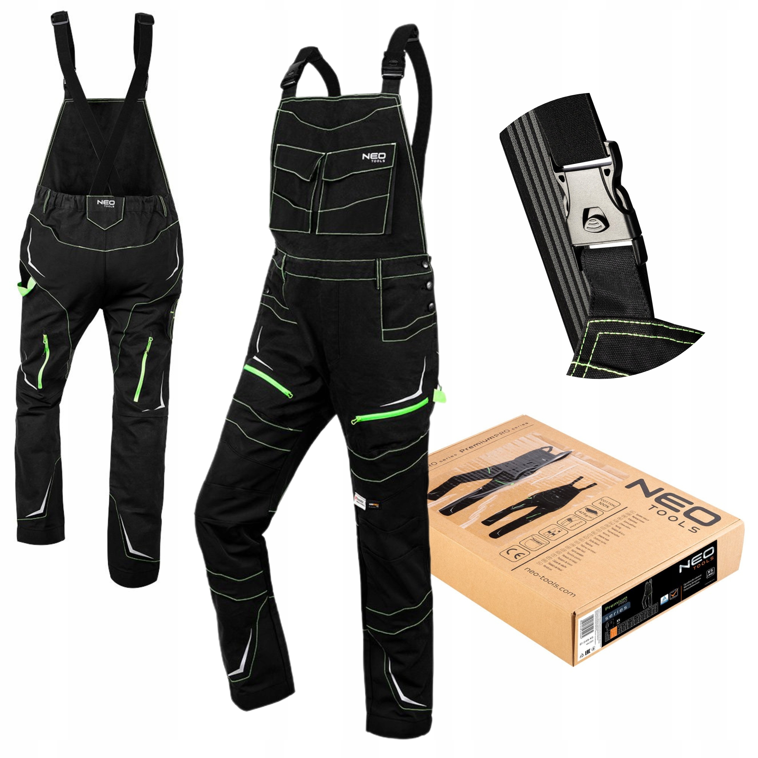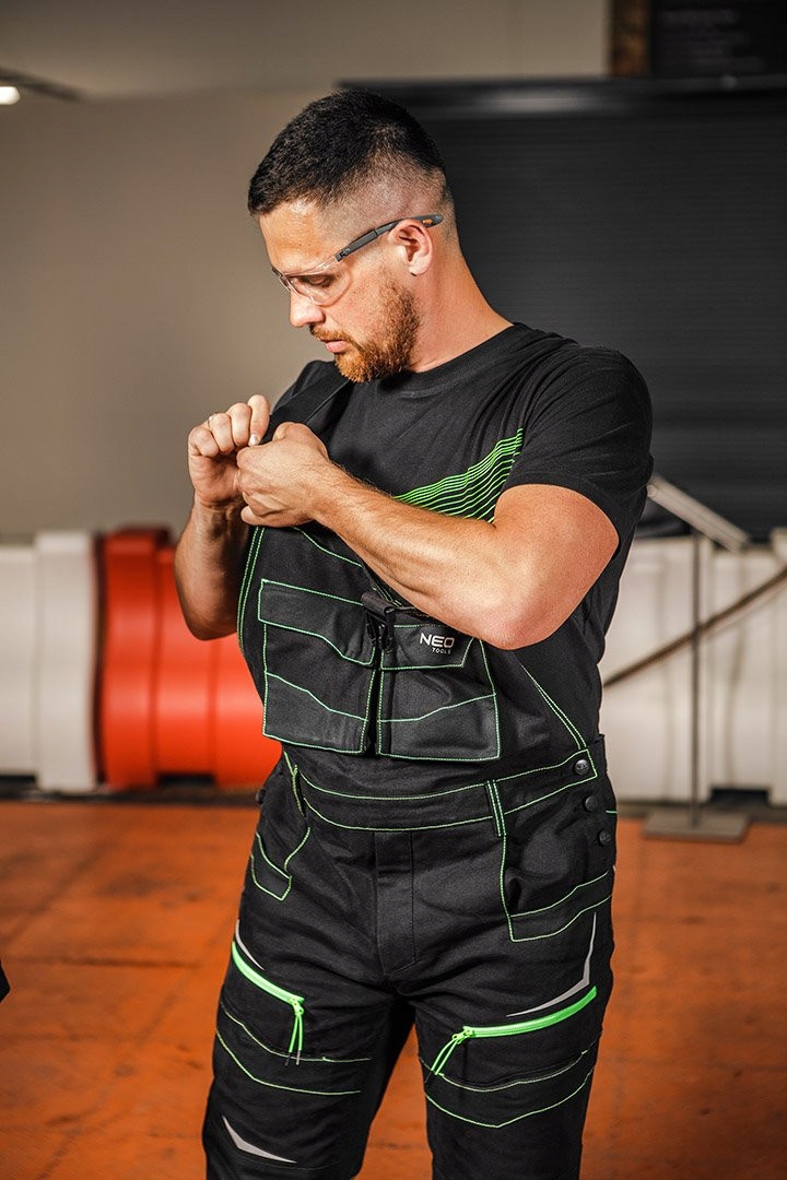 Ogrodniczki robocze od marki NEO posiadają potrójne szwy, wzmocnienia na kieszeniach, kolanach, tyle i dole nogawek. Odblaskowe nadruki zapewniają bezpieczeństwo po zmroku, a solidne zamki YKK są niezawodne w każdej sytuacji. Ogrodniczki posiadają wiele praktycznych kieszeni, m.in. dwie na zamek, sześć zamykanych na napy magnetyczne, ale także praktyczne zaczepy na narzędzia. Gumowe szelki z antypoślizgowym nadrukiem sprawiają, że odzież dobrze przylega do sylwetki. Posiada również z tyłu nogawek dodatkową wentylację na zamek kryty, a także profilowane kolana. Dół nogawek został wzmocniony Cordurą NYCO z możliwością wydłużenia spodni.