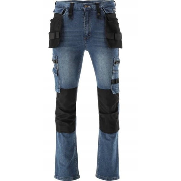 Spodnie robocze monterskie z elastanem wykonane z przetartego i rozciągliwego jeansu.