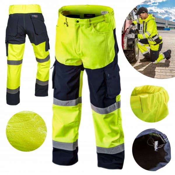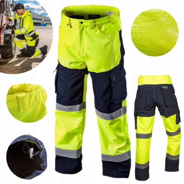 Ciepłe spodnie robocze NEO o intensywnej widzialności, wykonane z wysokiej jakości, wytrzymałego materiału softshell. Wiatro i wodoodporność oraz wewnętrzna strona polarowa zapewniają komfort również w mroźne i wietrzne dni. Zastosowana membrana o wodoodporności 8000 mm pozwoli na pracę w czasie deszczu. Elastyczne gumy w pasie zapewniają łatwiejsze dopasowanie rozmiaru. Elementy najbardziej narażone na zabrudzenia zostały wykonane w ciemnym kolorze. Solidne kieszenie wytrzymują nawet duże obciążenie i przechowają wszystkie niezbędne narzędzia. Regulowany ściągacz na nogawkach zapewnia dodatkową ochronę przed zimnem i wiatrem. Gwarantem jakości jest certyfikat europejski oraz wykonanie zgodne z normą EN ISO 13688:2013