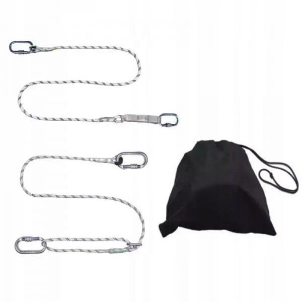 W zestawie poręczna torba na uprząż oraz dwie linki bezpieczeństwa z zakręcanymi karabinkami stalowymi typu owalnego. Końcówki liny zabezpieczone.