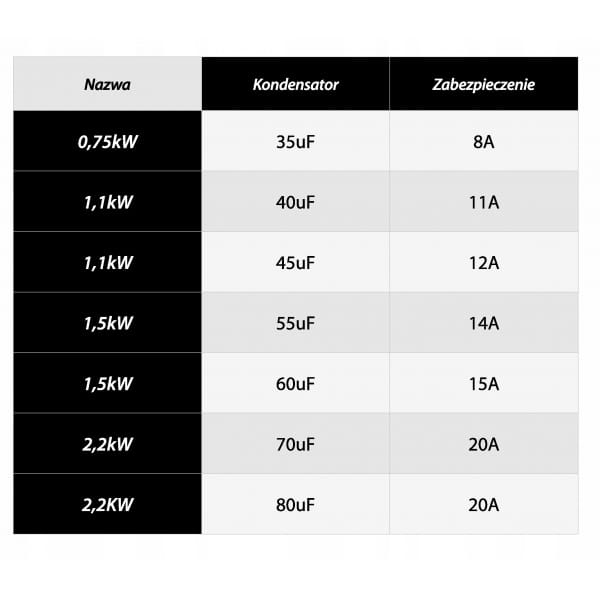Skrzynka jest uniwersalna i pasuje do pomp głębinowych różnych producentów. Należy jednak zwrócić uwagę na dwa parametry: wartość A dotychczasowego wyłącznika termicznego oraz wartość nF kondensatora rozruchowego. Max. różnica w wartości kondensatora to ok +/- 5%.