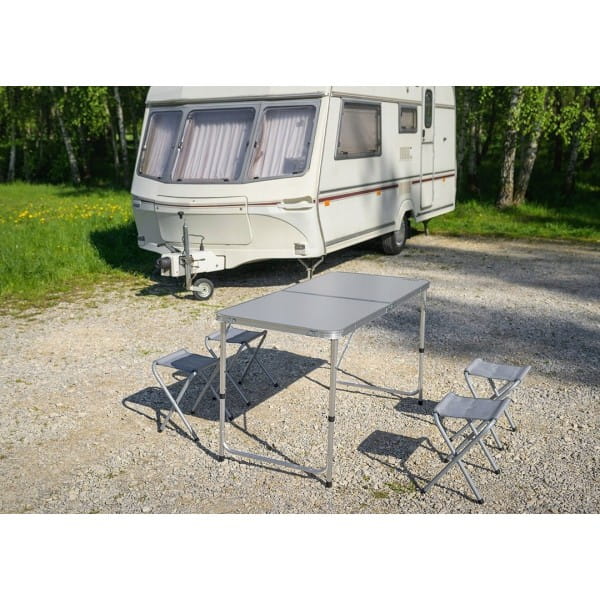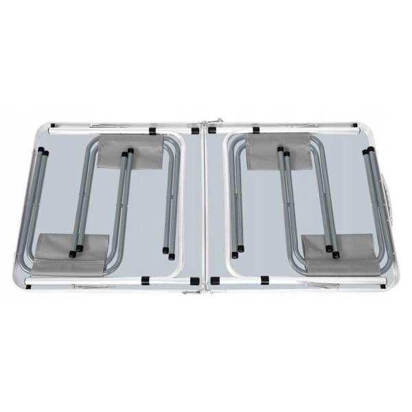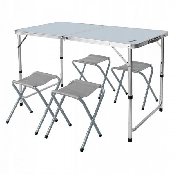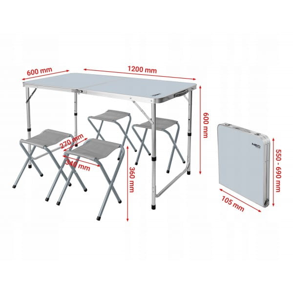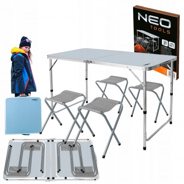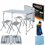 Zestaw biwakowy 63-159 NEO składa się na stół oraz cztery stołki. Blat został wykonany z trwałej płyty MDF, a konstrukcja z lekkiego aluminium. Stelaż stołków z kolei to solidna stal w połączeniu z wytrzymałym poliestrem. Zestaw składany w kompaktową walizkę z rączką transportową ułatwiającą przenoszenie, charakteryzuje się wymiarem 60 x 60 x 10,5 cm. Po rozłożeniu: długość stołu wynosi 120 cm, szerokość 60 cm, a wysokość od 54 do 70 cm. Możliwość regulacji stołu zwiększa jego zakres użytkowania. Obciążenie stołka to 110 kg, a wymiary – 33 x 27 x 35 cm.