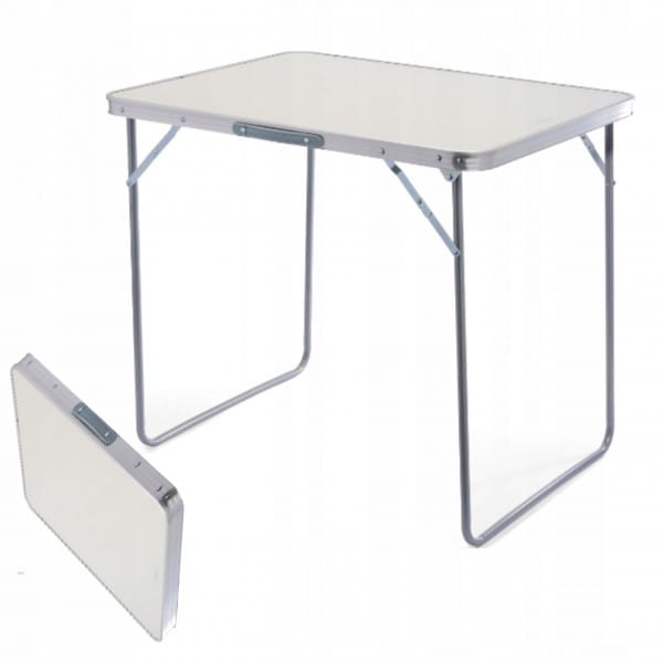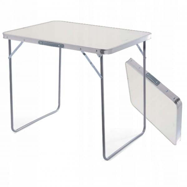 Stolik po rozłożeniu posiada wysokość 69 cm. Maksymalne obciążenie wynosi 30 kg. Blat stolika wykonany został z wysokiej jakości płyty MDF w białym kolorze i został zabezpieczony specjalną, odporną powłoką. Obręcz blatu została wykonana z aluminium w srebrnym kolorze.