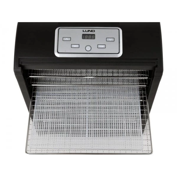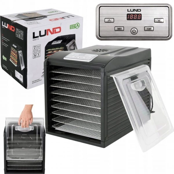 Suszarka elektryczna LUND przeznaczona do suszenia produktów spożywczych: owoców, warzyw, grzybów, kwiatów, ziół, mięs i ryb. Pozwala zachować wartości odżywcze i smakowe żywności konserwując ją na okres kilku miesięcy. Dzięki wbudowywanemu czasomierzowi istnieje możliwość zaprogramowania suszenia między 0,5 a 19,5 godziny. Dodatkowym atutem są akcesoria - siatka oraz tacka do suszenia małych produktów, np. ziół i herbaty