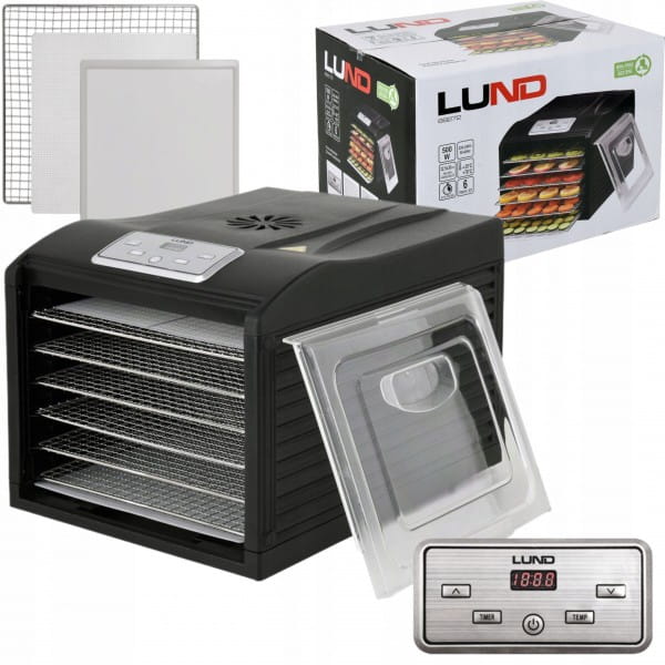 Suszarka elektryczna LUND przeznaczona do suszenia produktów spożywczych: owoców, warzyw, grzybów, kwiatów, ziół, mięs i ryb. Pozwala zachować wartości odżywcze i smakowe żywności konserwując ją na okres kilku miesięcy. Dzięki wbudowywanemu czasomierzowi istnieje możliwość zaprogramowania suszenia między 0,5 a 19,5 godziny. Dodatkowym atutem są akcesoria: siatka oraz tacka do suszenia małych produktów, np. ziół i herbaty.