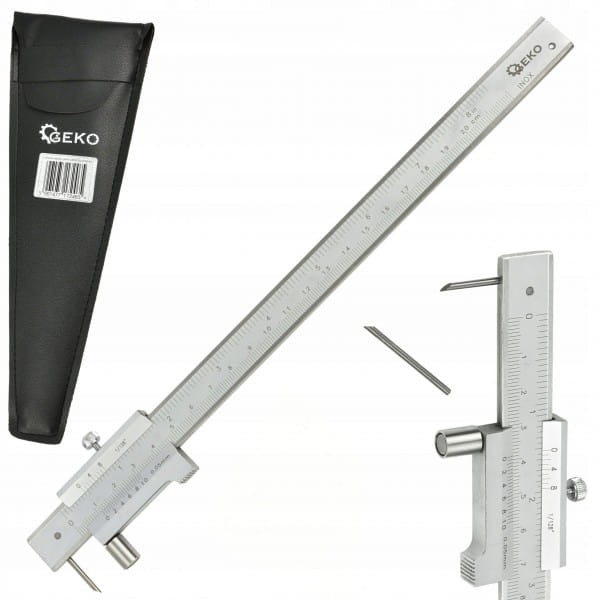 Suwmiarka traserska o długości roboczej 200mm oraz dokładności 0,05mm. Przeznaczona do precyzyjnego trasowania linii pomocniczych na obrabianych materiałach. Szczególnie przydatna podczas wiercenia, frezowania, toczenia itp. Wykonana ze stali nierdzewnej, wyposażona w rysik z hartowanej stali (drugi rysik w zestawie). Skala podana w mm oraz calach.