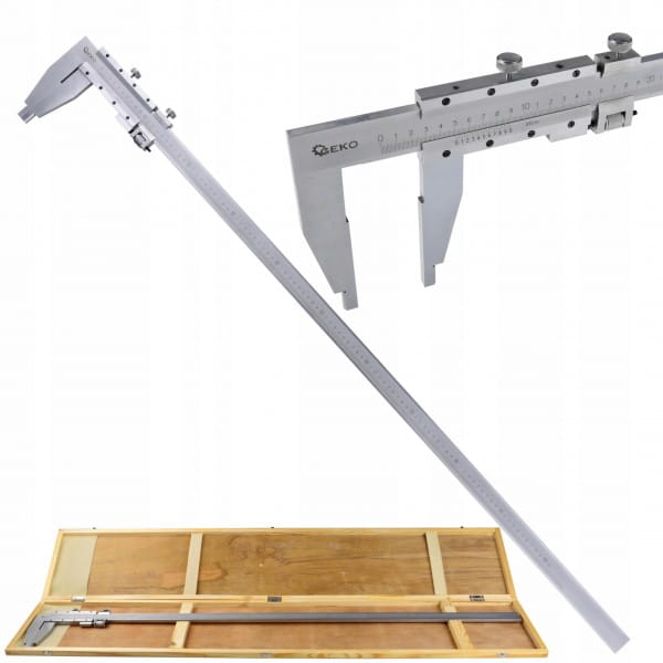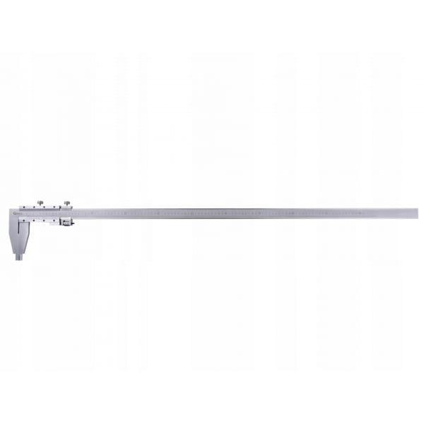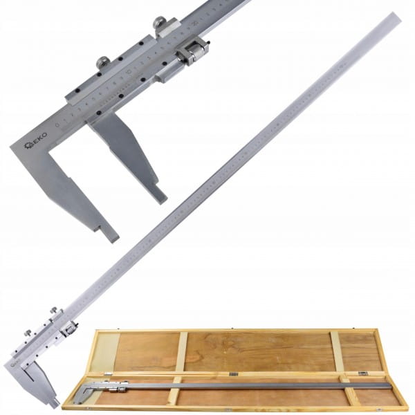 Suwmiarka o długości pomiarowej 1000 mm, wyposażona w pokrętło i suwak naprowadzający do precyzyjnej regulacji. Doskonale sprawdzi się w przemyśle, podczas obróbki metali, drewna itp.
