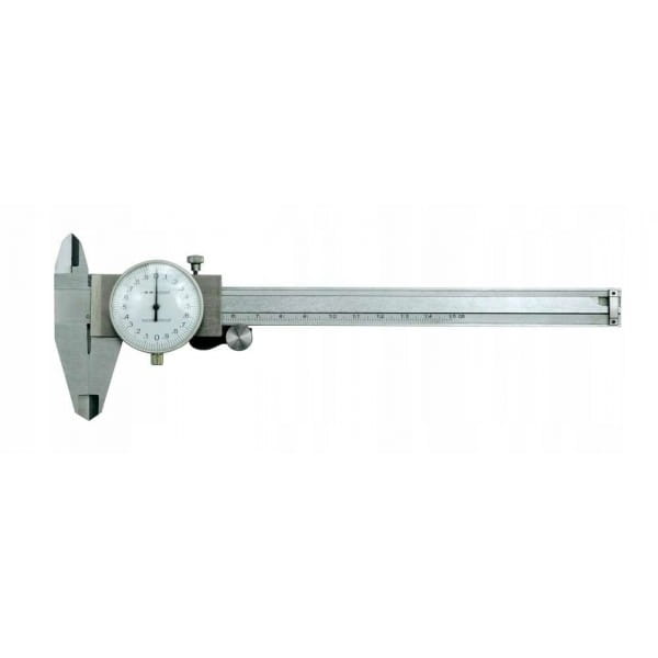 Wykonana ze stali nierdzewnej suwmiarka z odczytem zegarowym. Pozwala na pomiary wewnętrzne, zewnętrzne, pomiar głębokości i wysokości. Dokładność pomiaru 0,02 mm.