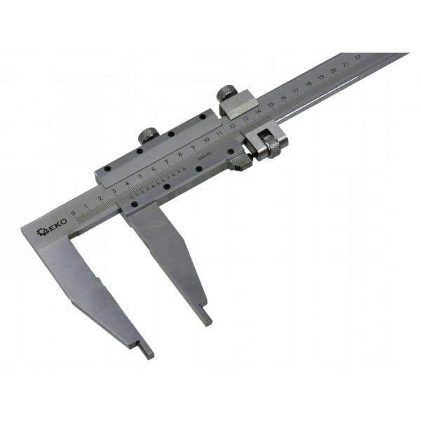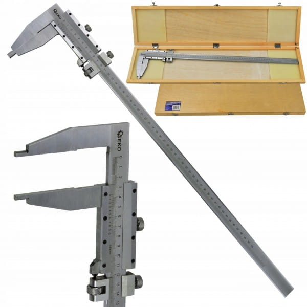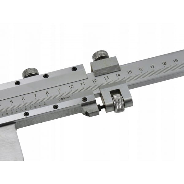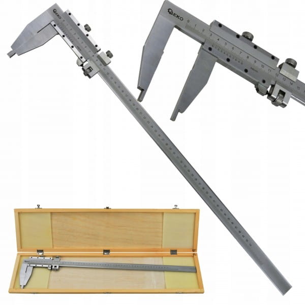 Suwmiarka o długości pomiarowej 1000 mm, wyposażona w pokrętło i suwak naprowadzający do precyzyjnej regulacji. Doskonale sprawdzi się w przemyśle, podczas obróbki metali, drewna itp.