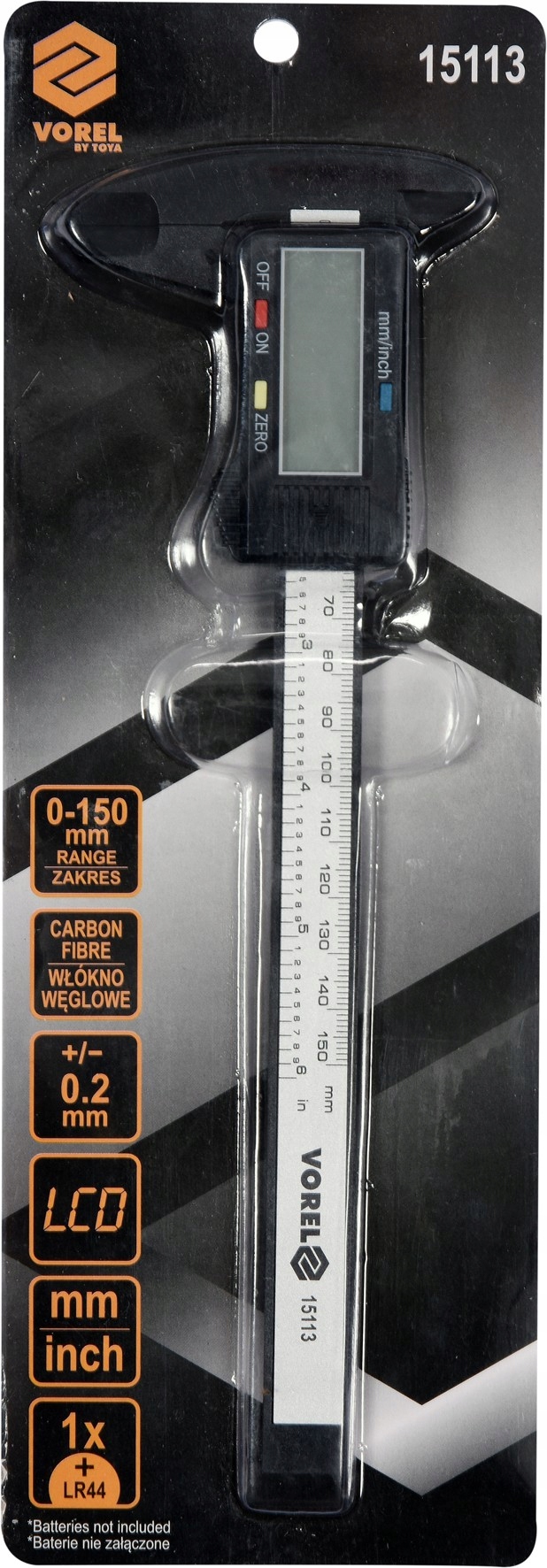 Suwmiarka elektroniczna 150 mm . Niezwykle lekka. Listwa pomiarowa i szczęki wykonane są z włókien węglowych /tzw. carbonu / Zakres pomiaru 150 mm, pomiar w mm lub calach, rozdzielczość 0,1 mm, dokładność 0,01 mm. Odczyt wyników na ekranie lcd. Zasilana bateriami sr44/lr44 1,5V lub cr2032 3V.