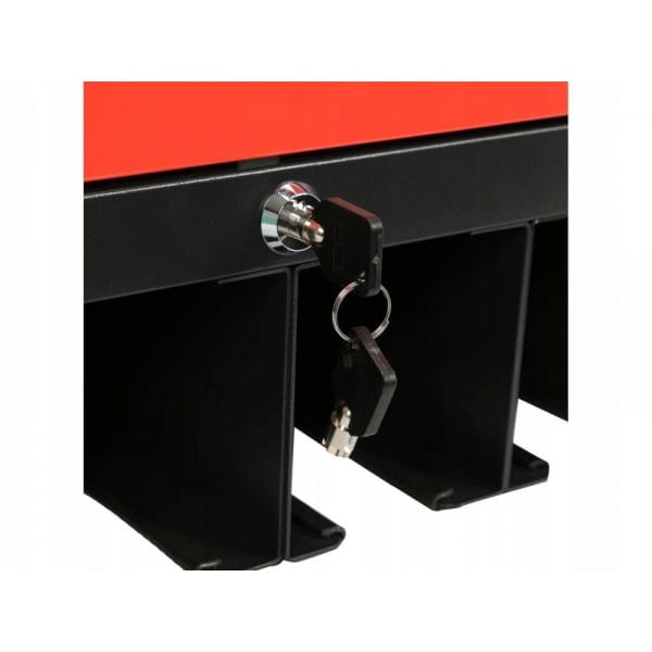 Zamykana szafka do przechowywania narzędzi warsztatowych. Do dyspozycji użytkownika jest półka górna nad szafką, oraz półka pod szafką z 4 kieszeniami do podwieszenia narzędzi.