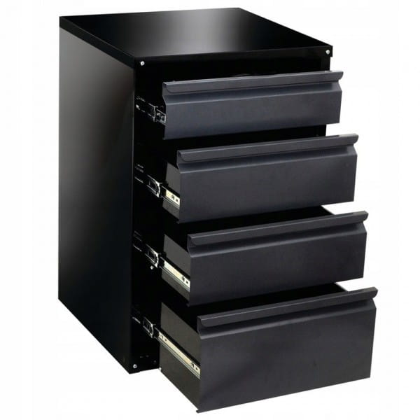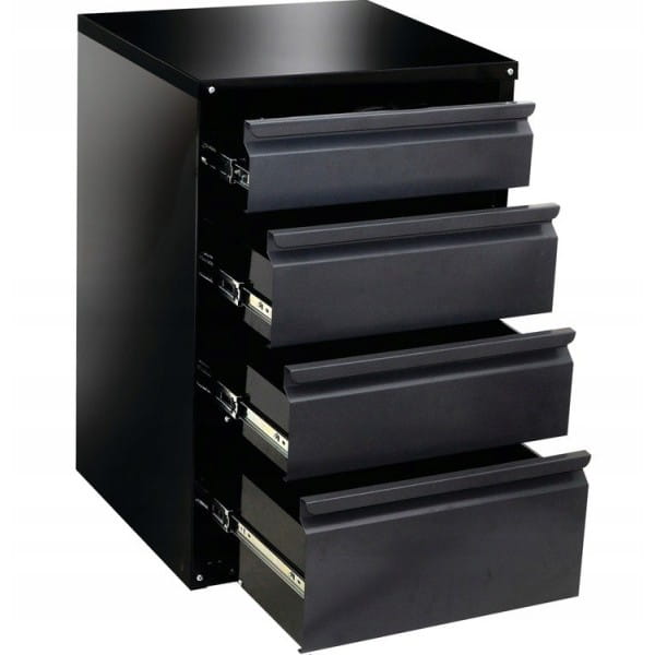 Szafka warsztatowa ułatwiająca utrzymanie porządku w garażu, pracowni czy serwisie samochodowym. Szafka wykonana z blachy stalowej lakierowanej na czarno. Eleganckie wykończenie sprawia, że pasuje do każdego warsztatu. Umożliwia stworzenie wygodnego miejsca pracy i zapewnia bezpieczne przechowywanie narzędzi. Szafka zbudowana jest z korpusu, w którym umieszczone są cztery solidne szuflady na prowadnicach kulkowych. Szafkę należy samodzielnie złożyć.