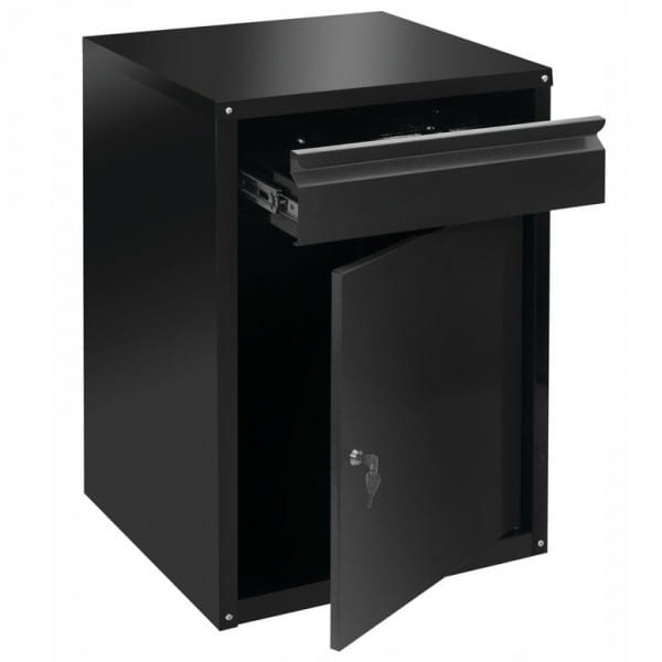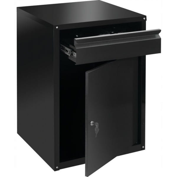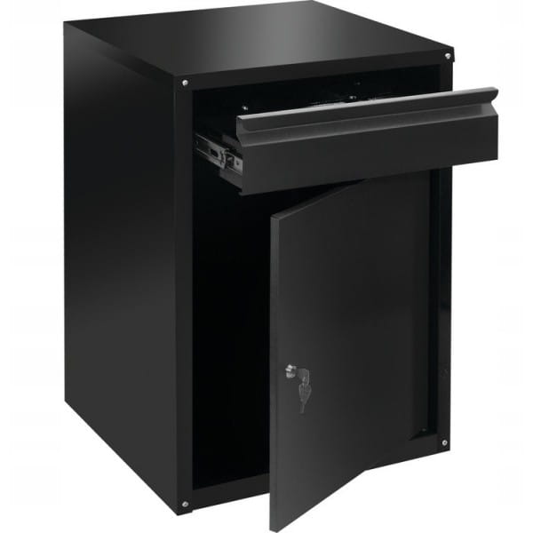 Szafka warsztatowa ułatwiająca utrzymanie porządku w garażu, pracowni czy serwisie samochodowym. Szafka wykonana z blachy stalowej lakierowanej na czarno. Eleganckie wykończenie sprawia, że pasuje do każdego warsztatu. Umożliwia stworzenie wygodnego miejsca pracy i zapewnia bezpieczne przechowywanie narzędzi. Szafka zbudowana jest z korpusu, w którym umieszczone są drzwiczki z zamkiem na kluczyk oraz jedna solidna szuflada na prowadnicach kulkowych. Szafkę należy samodzielnie złożyć.