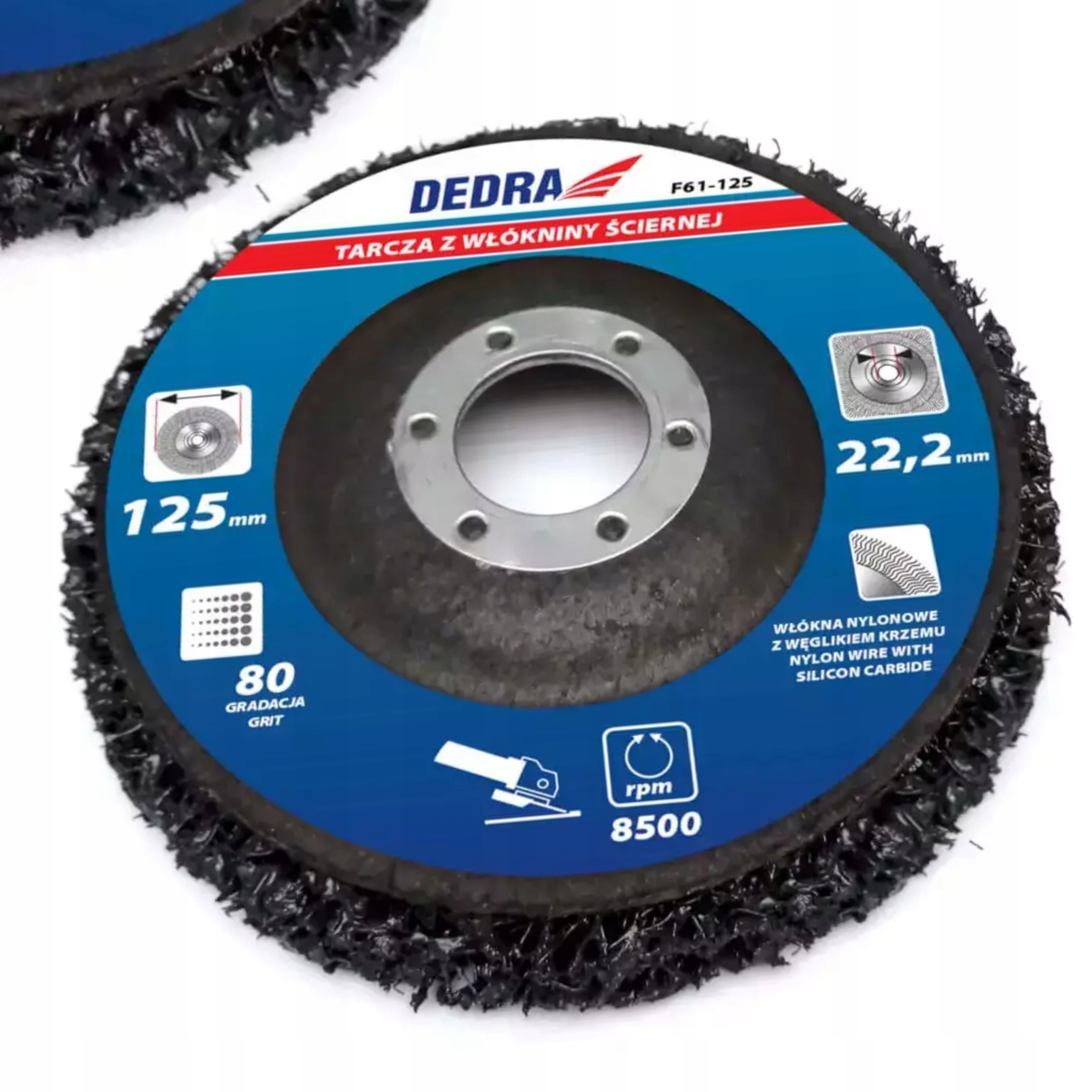 Tarcza z włókniny ściernej przeznaczona jest do montażu na wiertarce lub wkrętarce.Szczotka wykonana z włókien nylonowych pokrytych węglikiem krzemu. Służy do usuwania powłok lakierniczych, czyszczenia blach, spawów, usuwania rdzy.