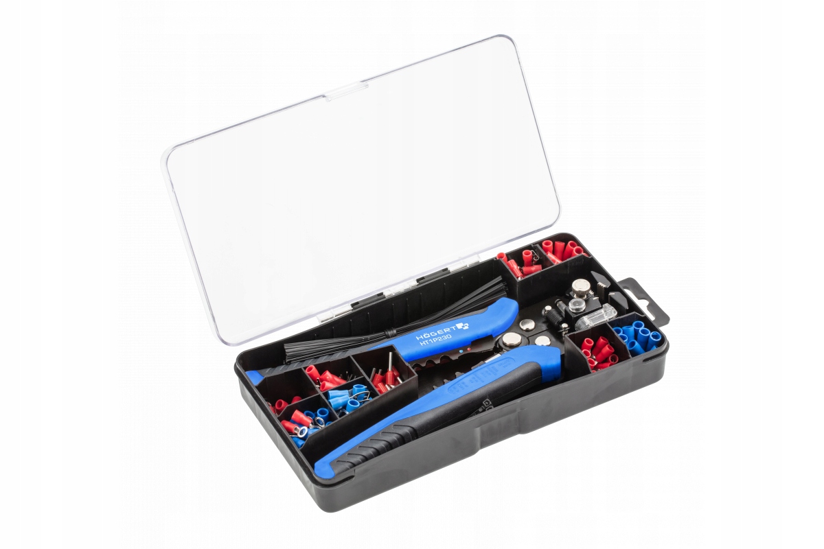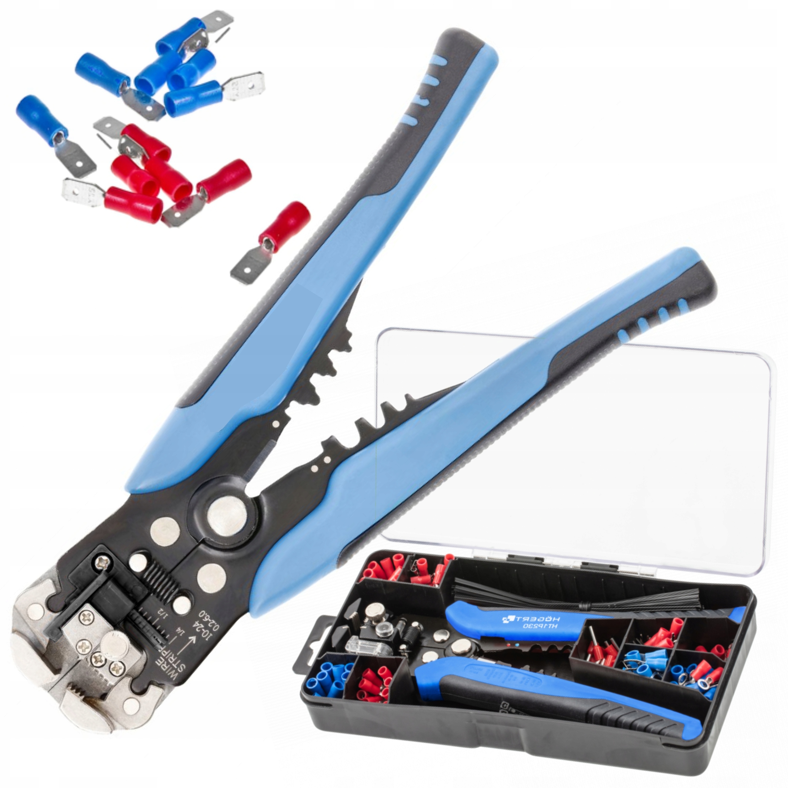 Szczypce automatyczne do ściągania izolacji z zestawem 200 szt. konektorów zapakowane w praktyczne opakowanie z tworzywa sztucznego. Wykorzystywane w elektronice, elektryce, telekomunikacji i innych pracach monterskich.