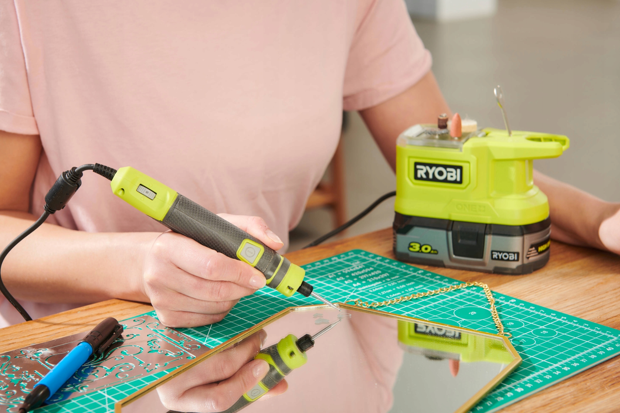 Precyzyjne narzędzie obrotowe Ryobi oferuje pięć zmiennych ustawień prędkości dla maksymalnej kontroli i dokładności. Narzędzie posiada wbudowany schowek na różne akcesoria. To narzędzie obrotowe jest idealne do szczegółowych zastosowań; grawerowanie metalu lub skóry, misterne rzeźbienie w drewnie, szlifowanie detali, polerowanie, czyszczenie.