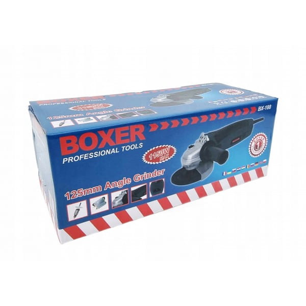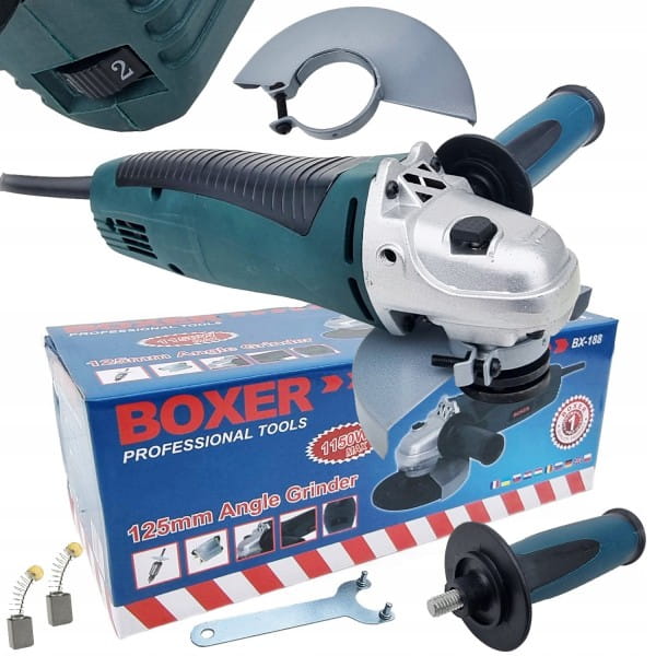 Szlifierka kątowa nowoczesnej marki BOXER przeznaczona do cięcia, szlifowania, oczyszczania materiałów takich jak: metal, drewno, beton, tworzywa sztuczne, i wiele innych. Znajduje szerokie zastosowanie w warsztacie, podczas prac remontowych i budowlanych. Wyposażona w bardzo mocny i wydajny silnik 1150W który z łatwością uzyskuje prędkość na poziomie 10000 obr/min, z możliwością regulacji za pomocą pokrętła.