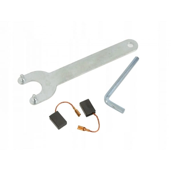 - w zestawie znajdują się: uchwyt boczny, osłona tarczy, klucz imbusowy do regulacji osłony, komplet zapasowych szczotek węglowych, klucz do montażu tarczy